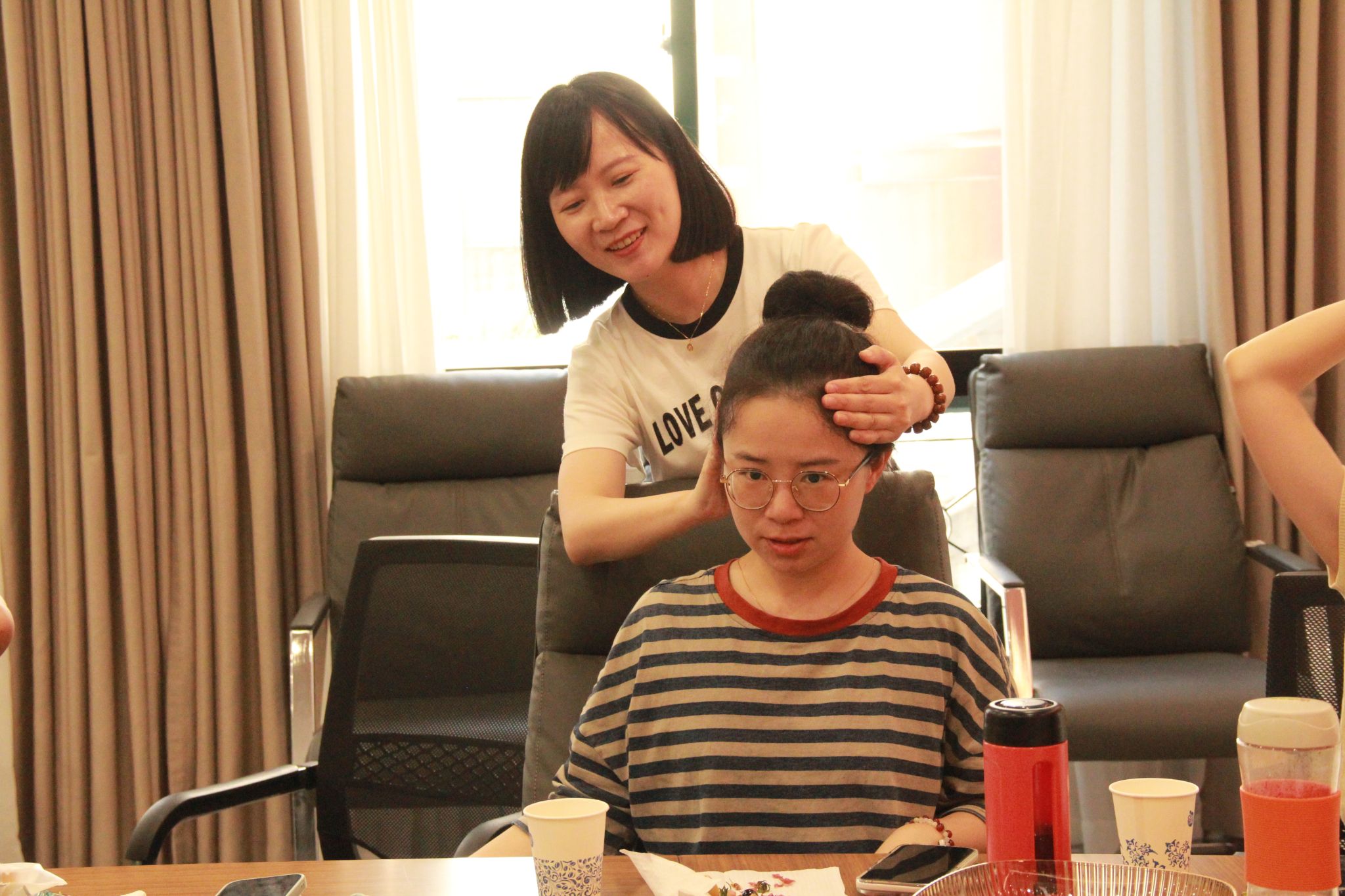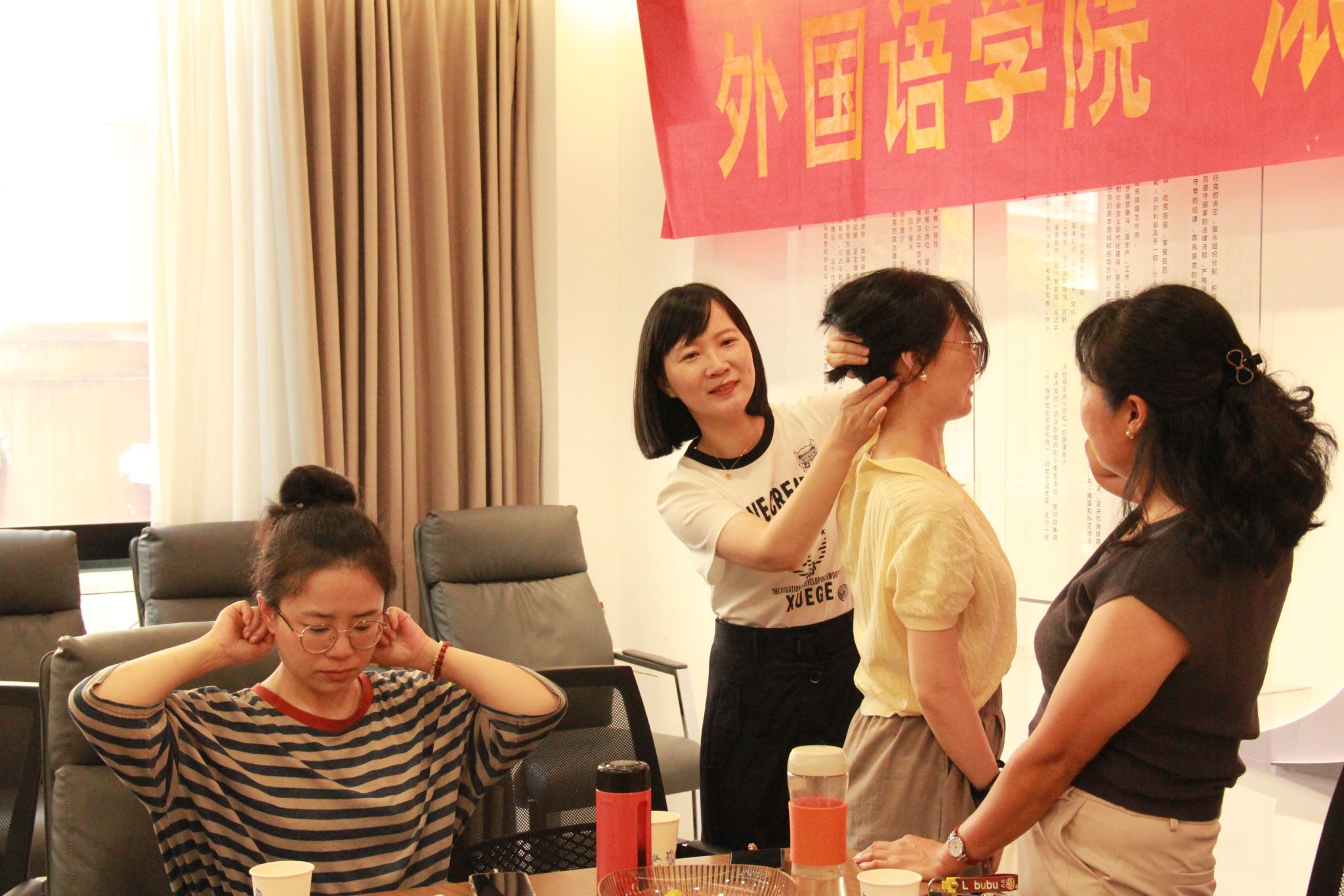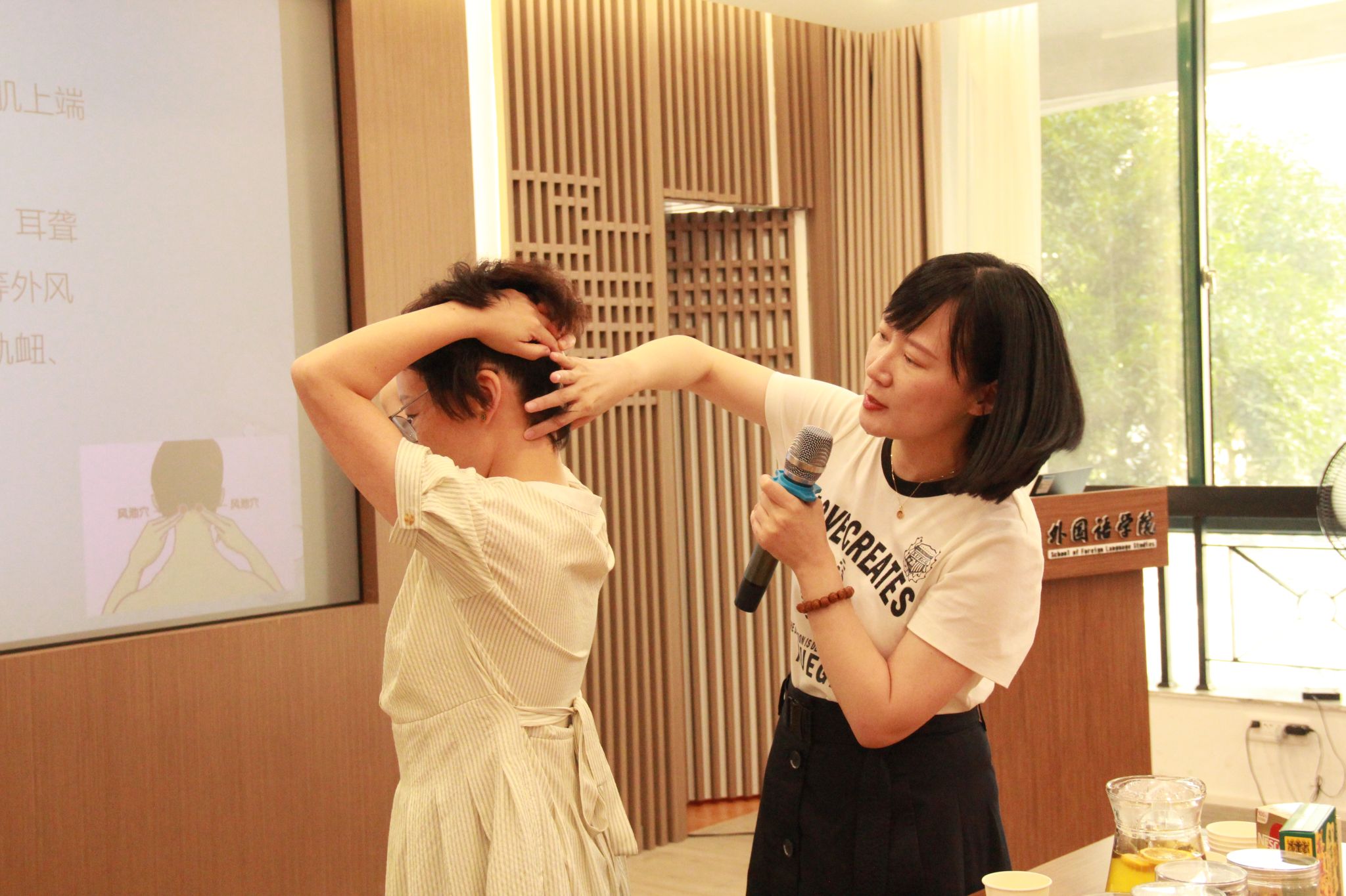 讲座过程中,潘主任还现场演示了针对肩颈、腰背等关键穴位的定位与按压方法。老师们跟随专家的指导,纷纷动手寻找并体验风池、肾俞等穴位的按压感觉,直观地感受到了中医穴位按摩在缓解疲劳、舒筋活络方面的即时效果。