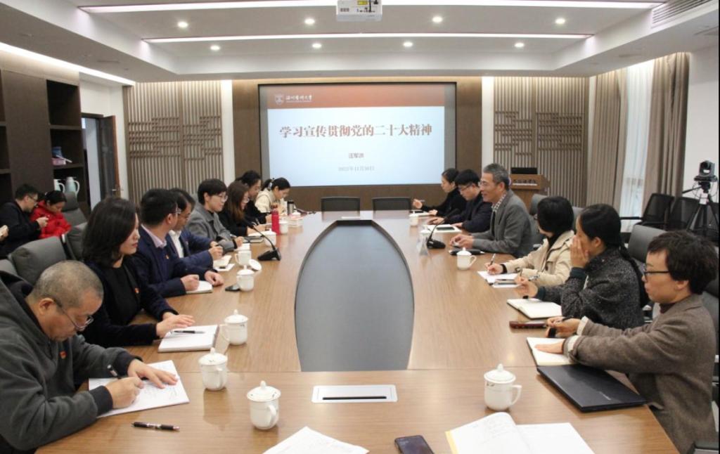 宣讲二十大精神,校后勤发展处副处长卞成德陪同。全体院领导、党总支理论中心组成员、党支部书记及支委、党外人士代表参会,会议由院党总支书记柯奔主持。