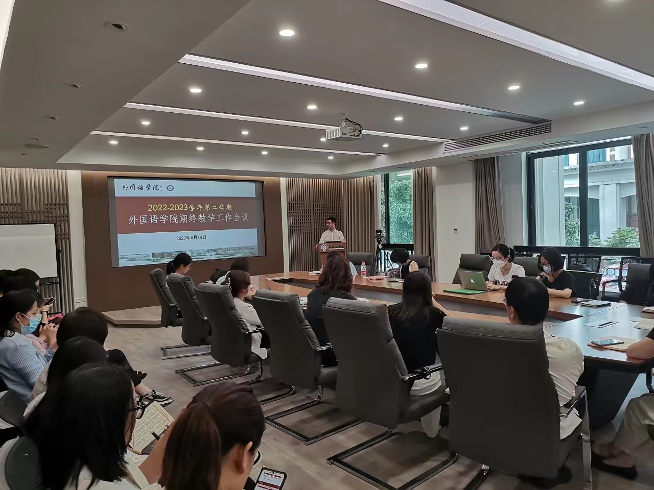 期终教学工作会议在学院7B104会议室举行。会议由戴建春副院长主持。大学英语教研部、医学英语教研部、英语系、日语系、外语技能拓展部的部门负责人、各教研室教研室主任、各系部教学秘书出席会议。