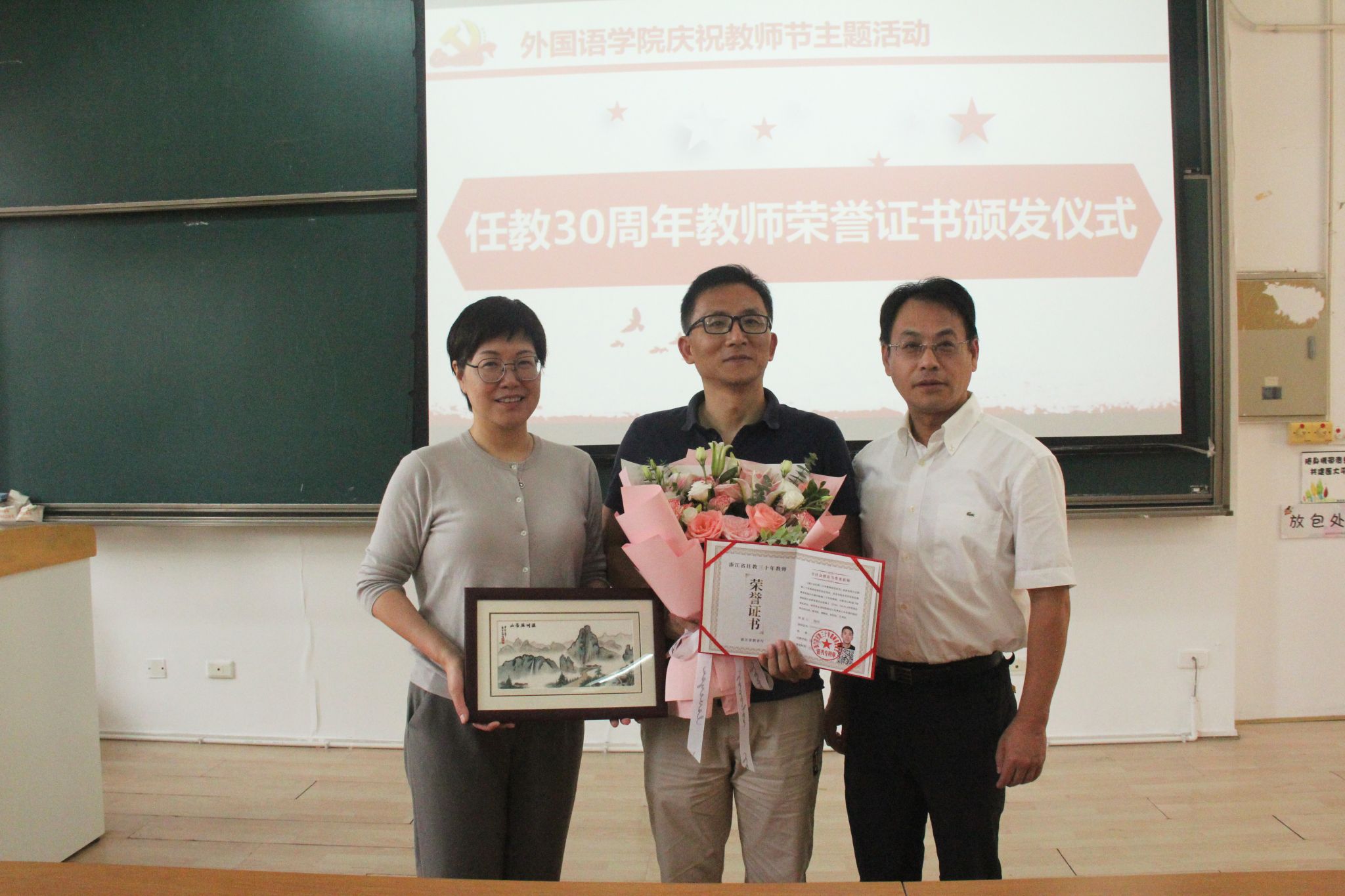 开展庆祝教师节专项活动,时值第39个教师节来临之际,学院为全体教师送上鲜花,提前送上节日祝福。今年教师节的主题为“躬耕教坛,强国有我”,为激励教师切实担当为党育人、为国育才的光荣使命,学院为任教满30周年教师陶刚举行荣誉证书颁发仪式。陶刚结合自身工作经历分享了从教三十年的工作心得,他坚守教育初心,潜心教书育人,在教学岗位上积极传递正能量,实现自己的教育理想,成就美好的教育生涯。