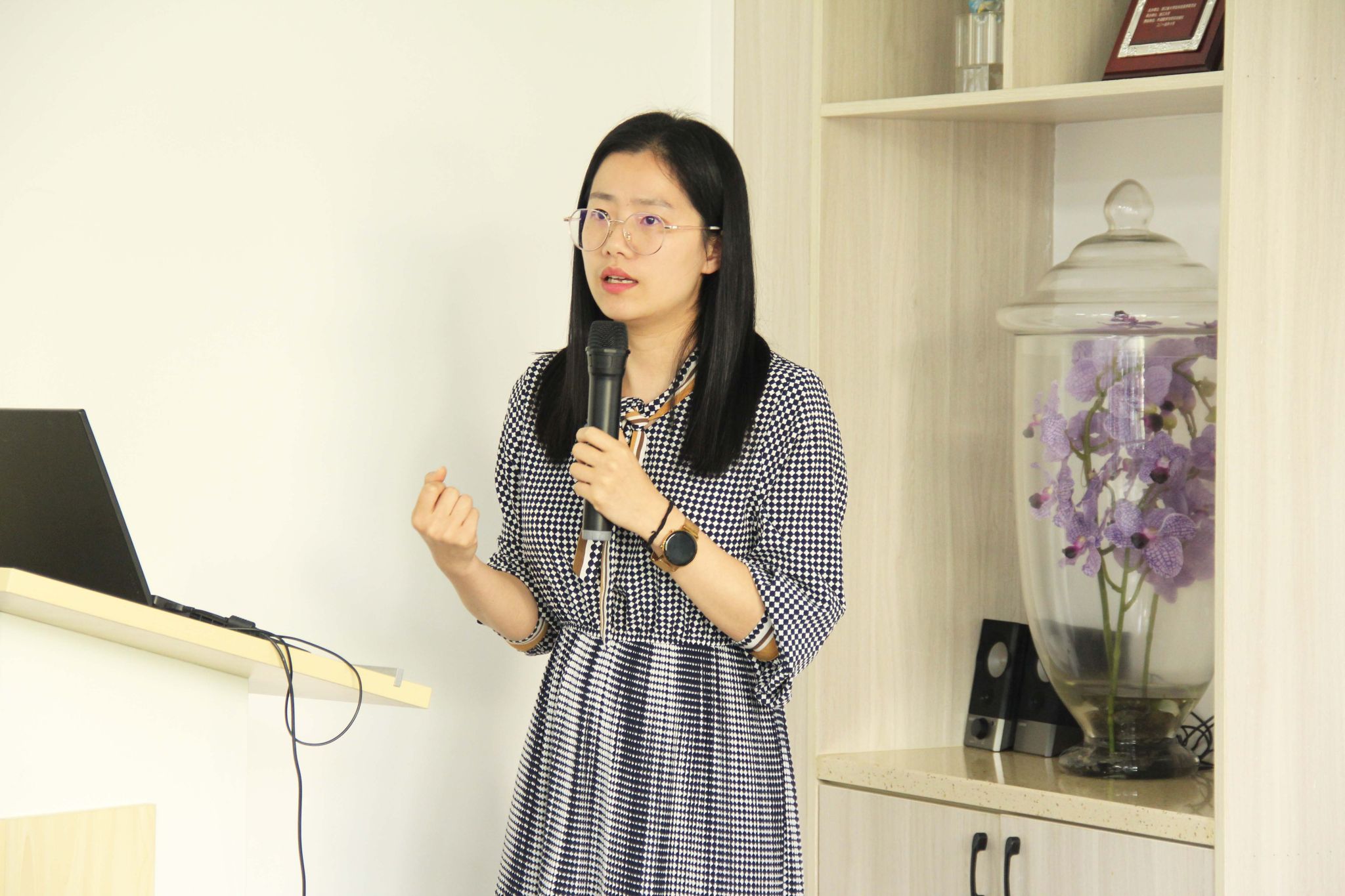 潘惠副教授以“课程思政视域下《跨文化交际》教学改革探索”为题,分享自己在剑桥大学的访学经历和对跨文化交际课程改革的思考。她介绍了部分出国访学项目的申报要求、选拔条件与资助方式等,鼓励学院青年教师积极申报。她还分享了对《跨文化交际》课程进行课程思政教学改革的思路,并强调,教师要积极实践“课程思政”的理念,以语言知识和语言技能为桥梁,在培养学生跨文化交际能力的同时,增强学生的文化自信。