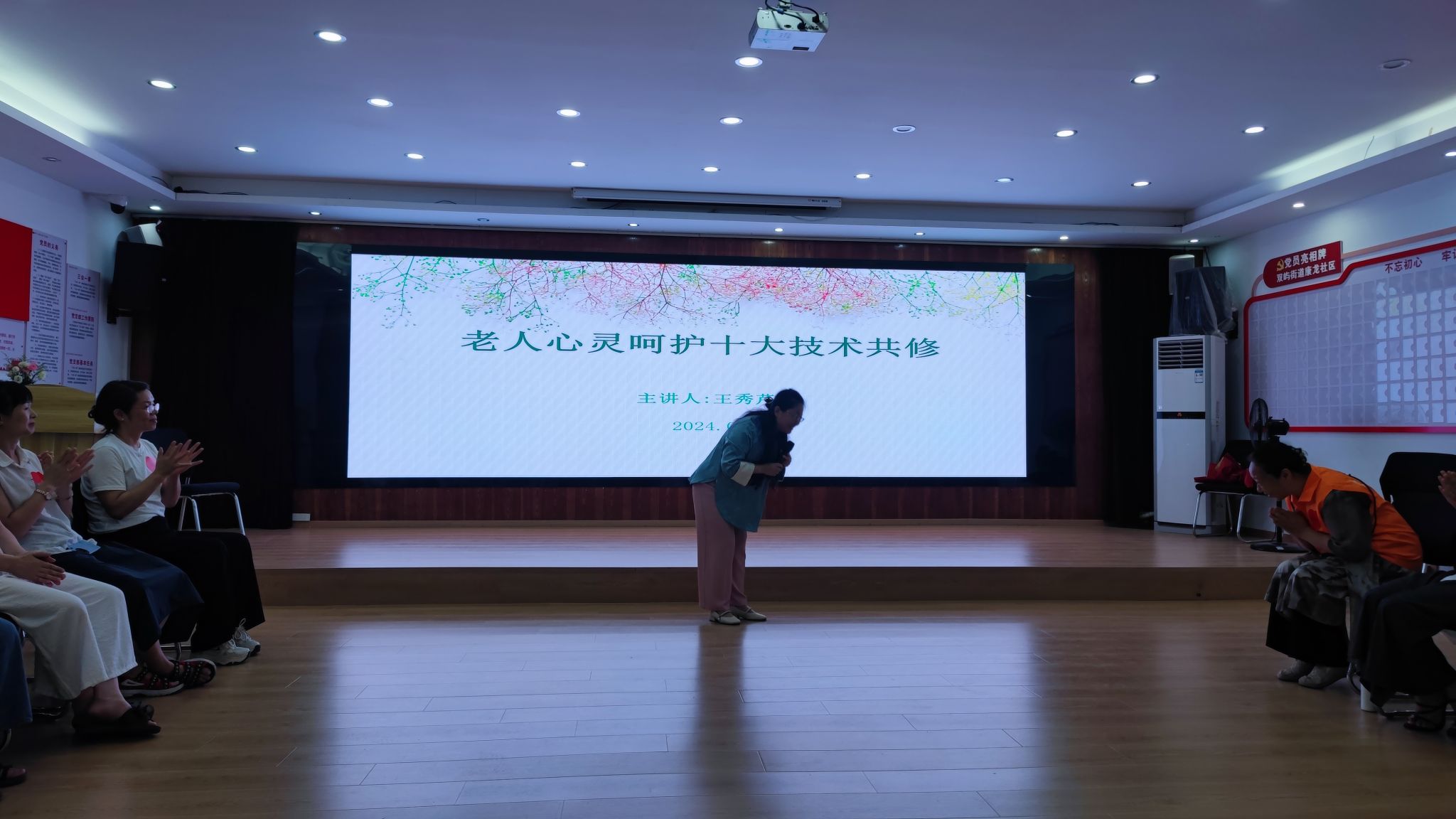培训中,王秀芹以理论结合案例,深入浅出地讲解了老人心灵呵护十大技术的内涵及应用。她以感人励志的人生故事和志愿服务经历,阐释陪伴生命、喜悦成长的真谛,激发学员们内心最质朴无私的爱。通过情境代入和模拟互动,学员们在祥和注视、用心倾听、同频呼吸、经典诵读、音乐沟通、抚触沟通、动态沟通、“零极限”技术沟通等十大呵护技术的体验与践行中放空自我、提升共情。