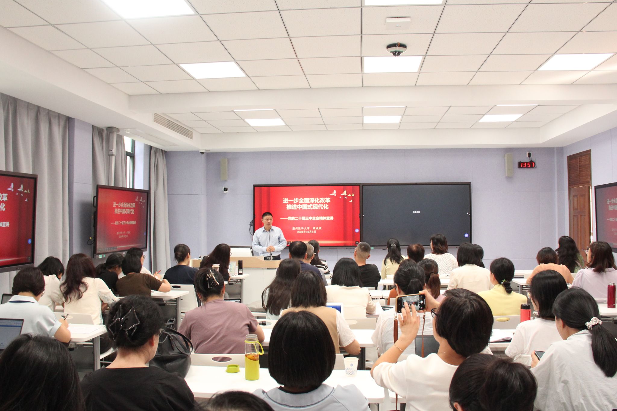 宣讲二十届三中全会精神,校研究生院党委书记郑曼曼陪同。学院全体教职工参会,会议由院党委书记刘洁主持。