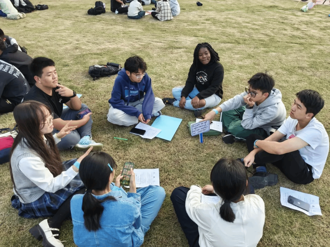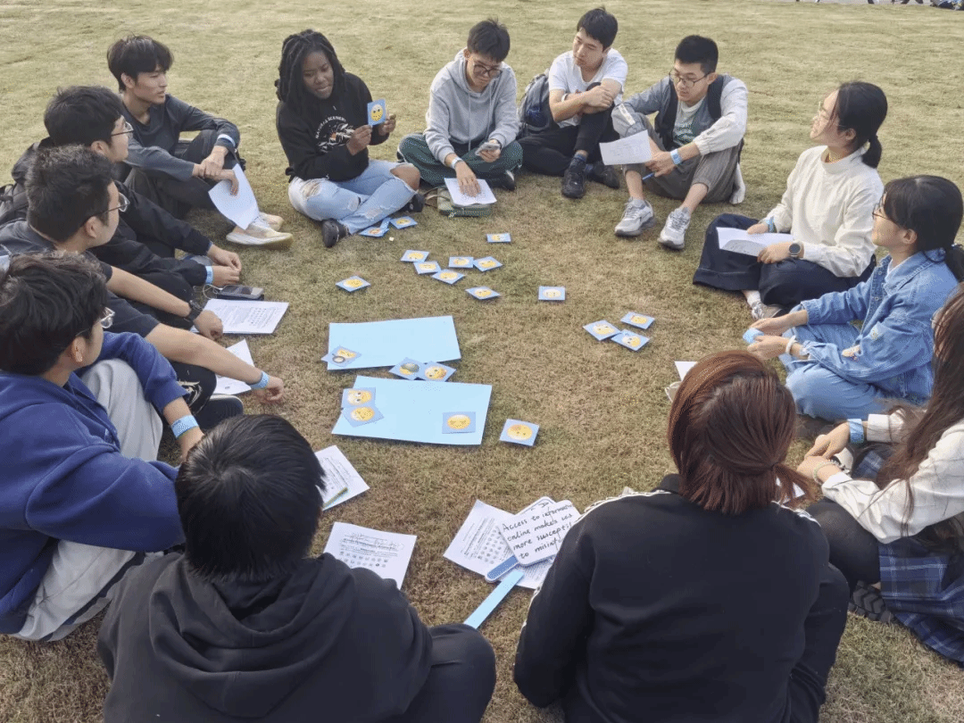 有着与英语角特制手环对应颜色的卡片被放置在草坪的各处,同学们可以在签到时自由选择颜色,加入不同的小组展开活动。绚丽的色彩仿佛组成了一道道彩虹,和同学们的思维一通跃动着。