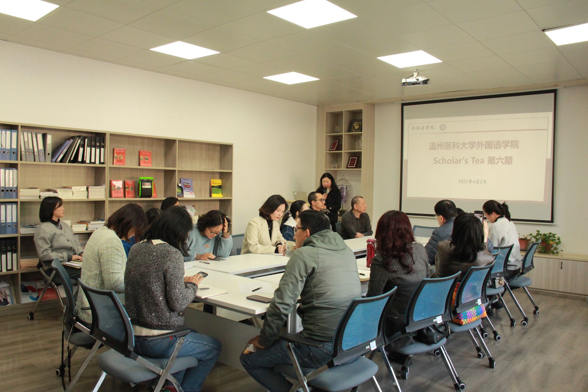 在同仁楼B102教授工作室顺利举办“Scholar’s Tea”第六期活动。此次活动特邀学院曾金元老师和FARAH RIDA博士作为嘉宾进行学术分享。学院副院长章艳乐出席,学院教师20余人参与本次活动,活动由王丹副教授主持。