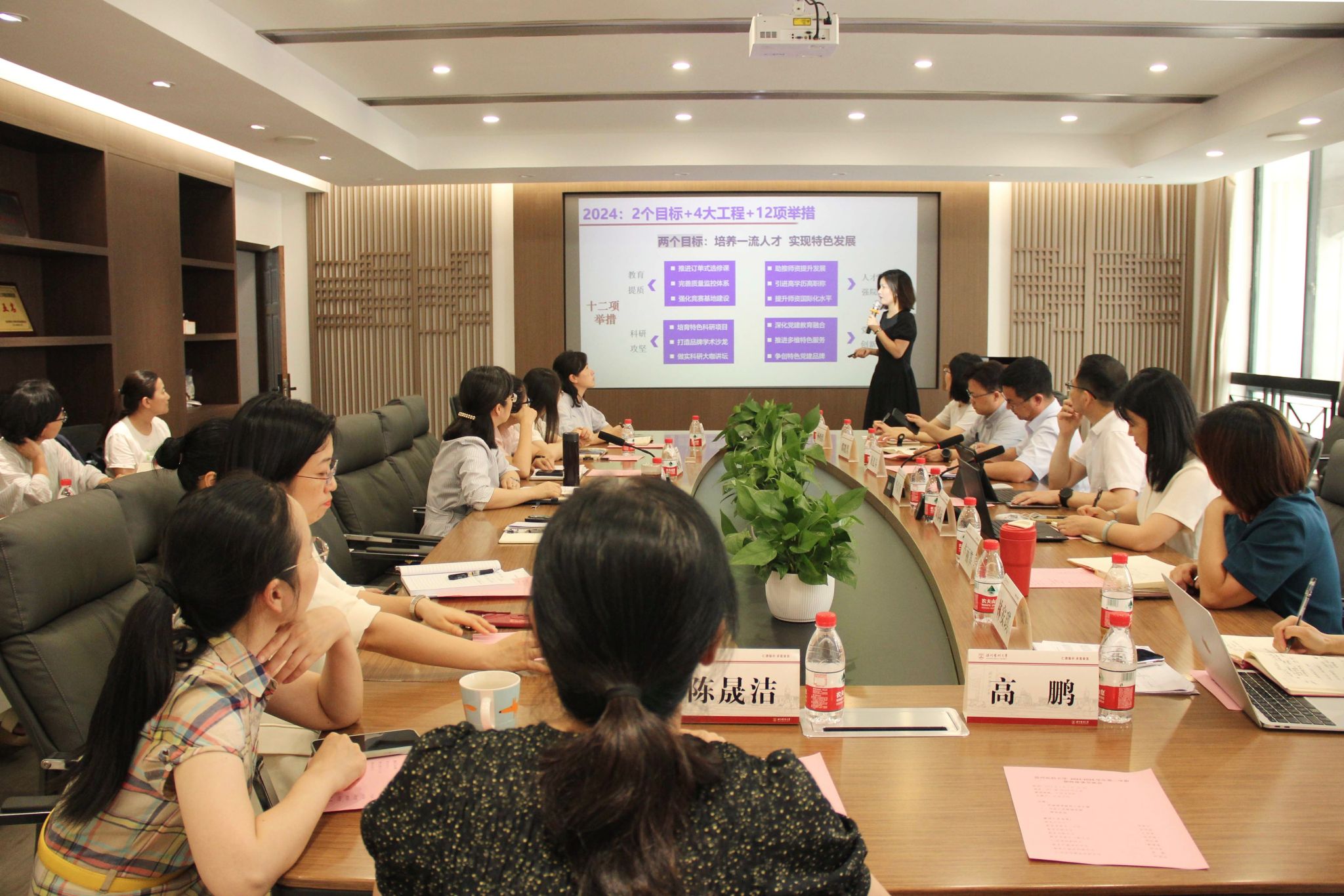 7月2日下午,校教务处处长李章平、教学发展中心主任金伟琼、仁济学院副院长戴建春及相关职能科室负责人等一行来访91探花 ,开展教育教学专题调研。学院党委书记刘洁主持会议,学院副院长章艳乐、各系部主任及学院办主任共20余人参加会议。